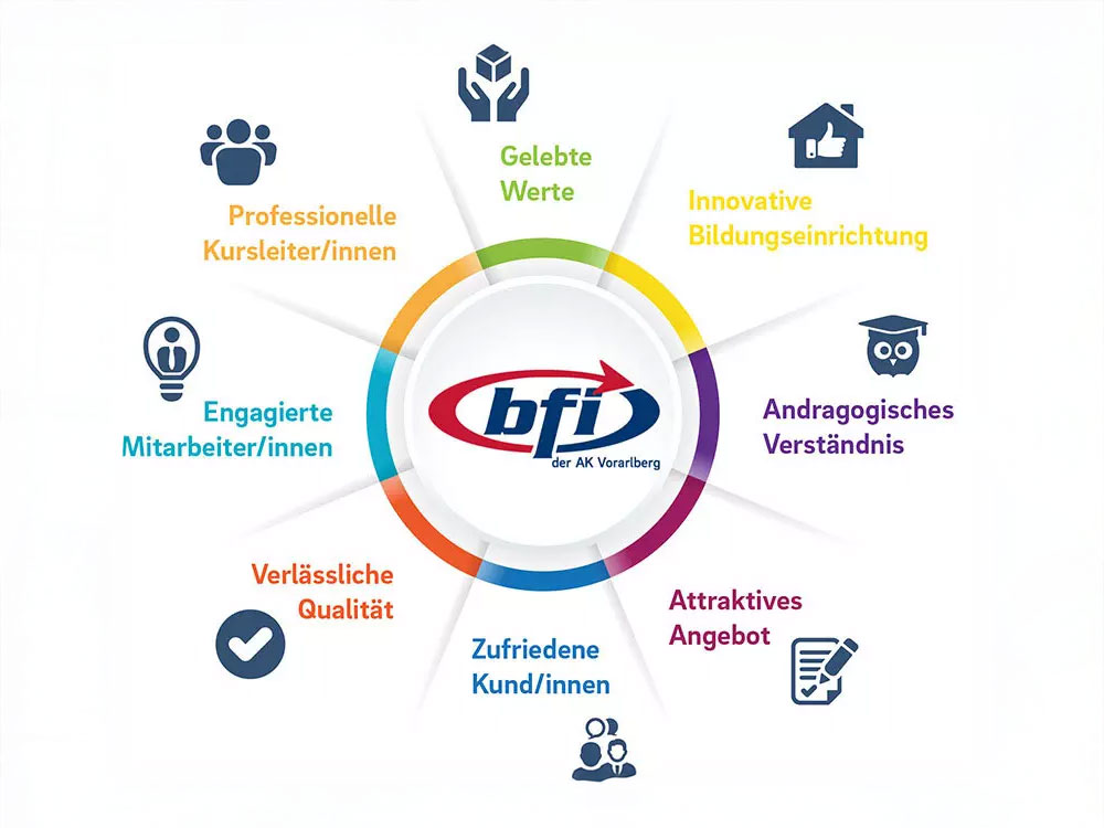 Wir sind eine Bildungseinrichtung, die qualitativ hochwertige Aus- und Weiterbildung anbietet und dabei stets die Interessen der Kundinnen und Kunden im Fokus behält. Neue, innovative und kreative Ideen fließen in die bedarfsorientierte Entwicklung von Kursangeboten ein. Für uns steht der Mensch in seiner Gesamtheit im Mittelpunkt. Dies umfasst den Wissenserwerb, die Entwicklung von Fähigkeiten, Kompetenzen und Wertehaltungen. Neben der beruflichen Qualifizierung liegt unser Fokus auf der Stärkung der Persönlichkeit. Unser primäres Ziel ist die Förderung von Chancen auf dem Arbeitsmarkt. Wir legen großen Wert auf eine hohe Kunden- und Mitarbeiterzufriedenheit. Flexibilität, Kreativität und Innovationskraft betrachten wir als wesentliche Faktoren für die Zukunft.